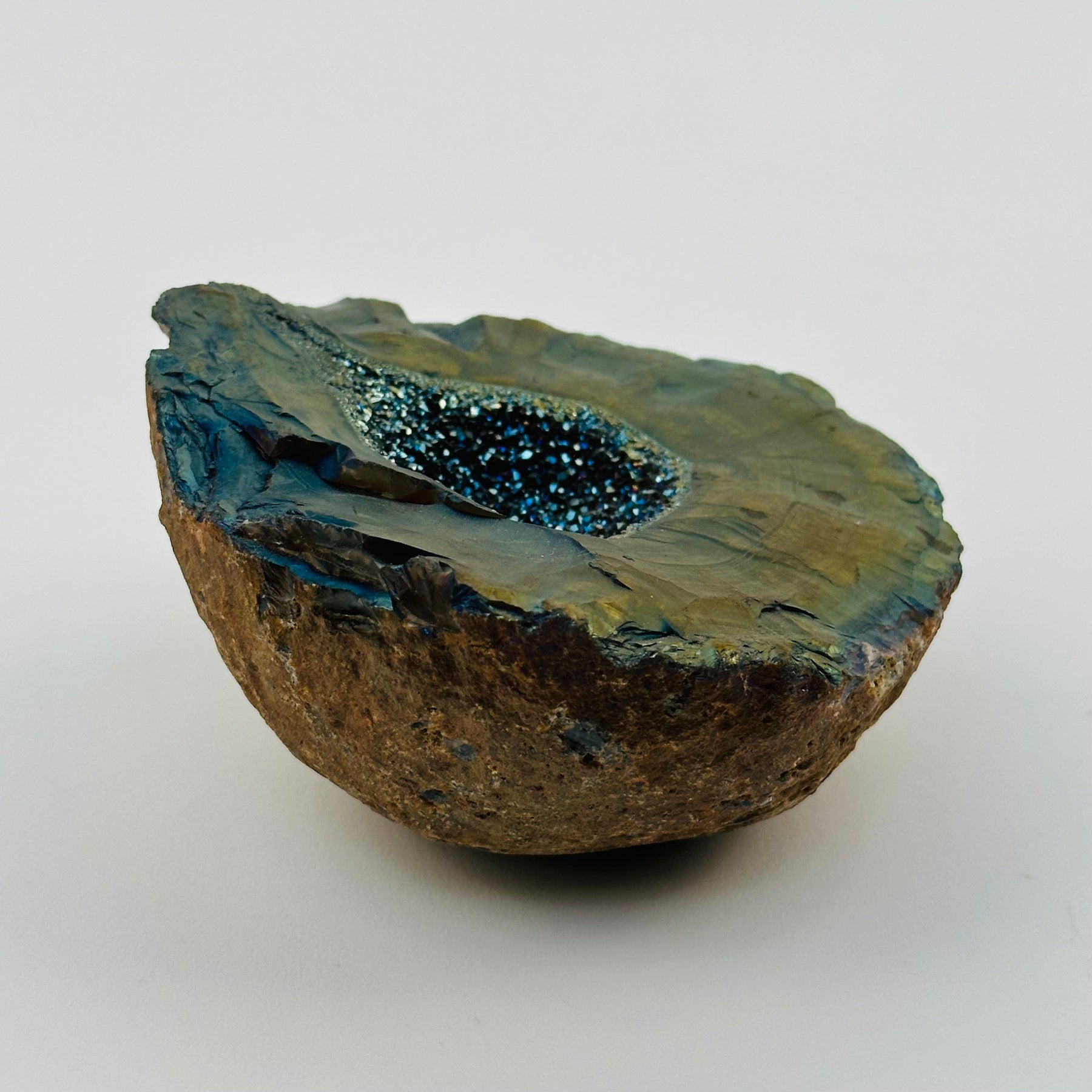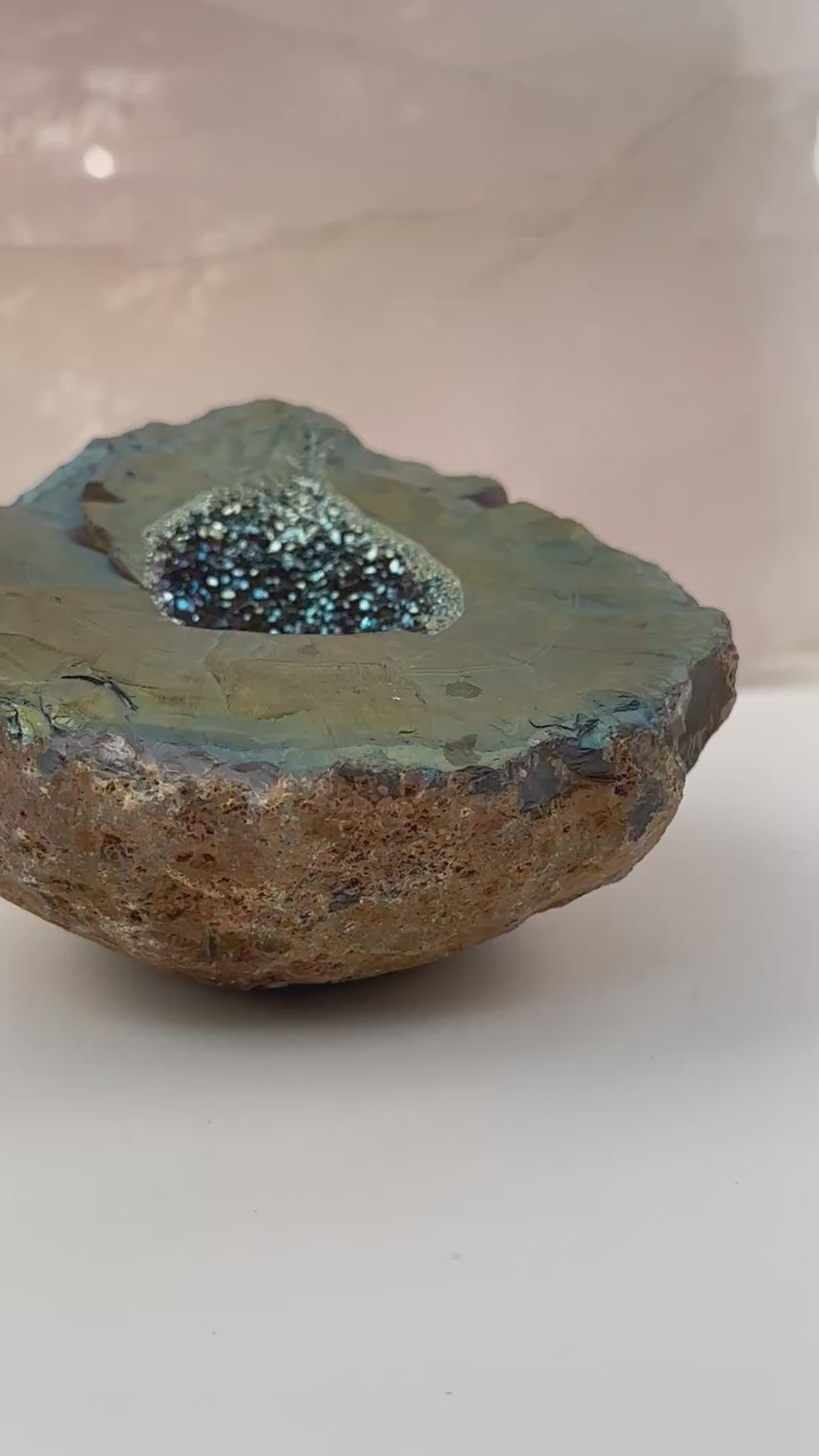 Content: One of a kind Rainbow Titanium Treated Crystal Geode with Druzy