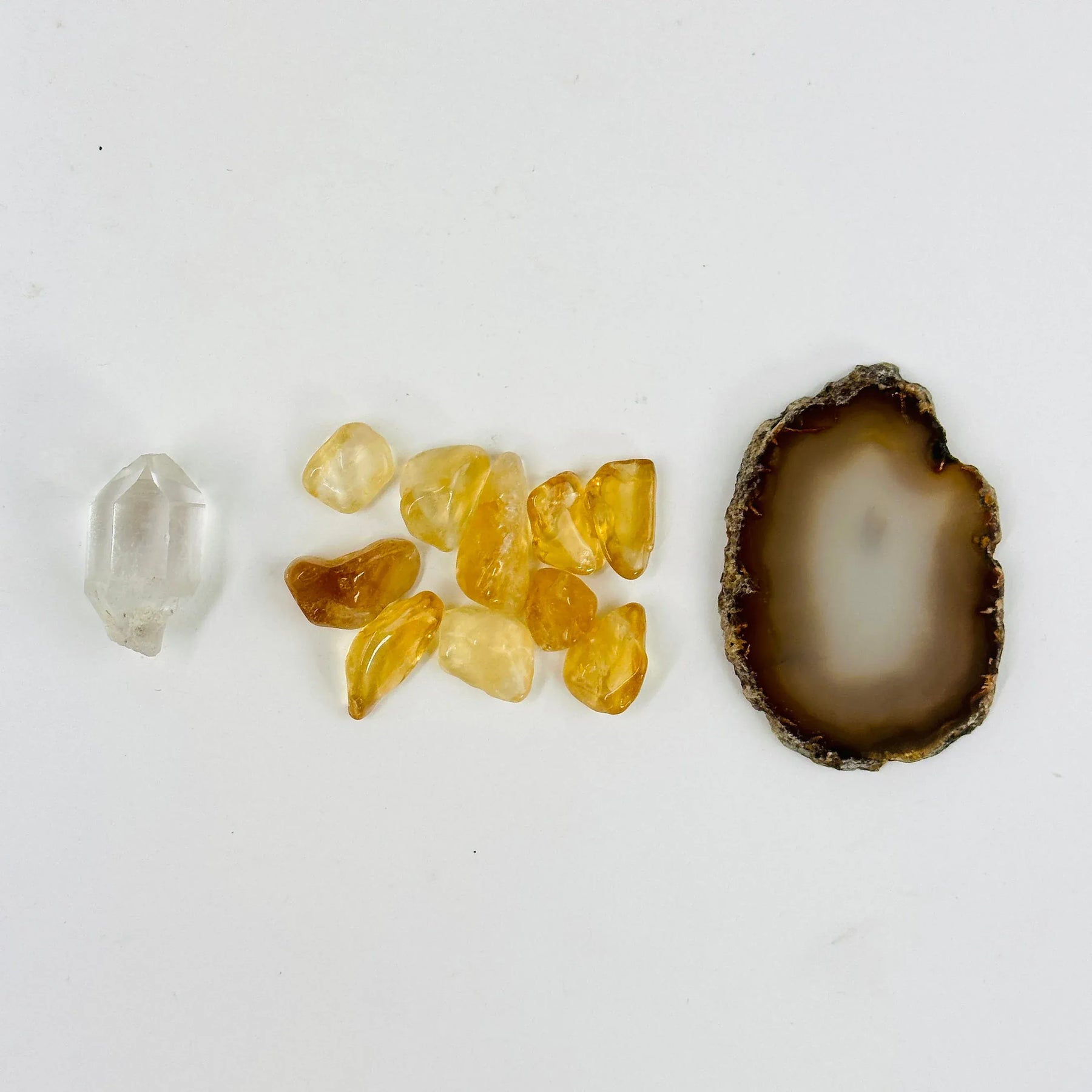 This listing is for a Crystal Variety Pack with Agate Slice, Tumbled Citrine pieces, and a small Crystal Point - (UP6-257)