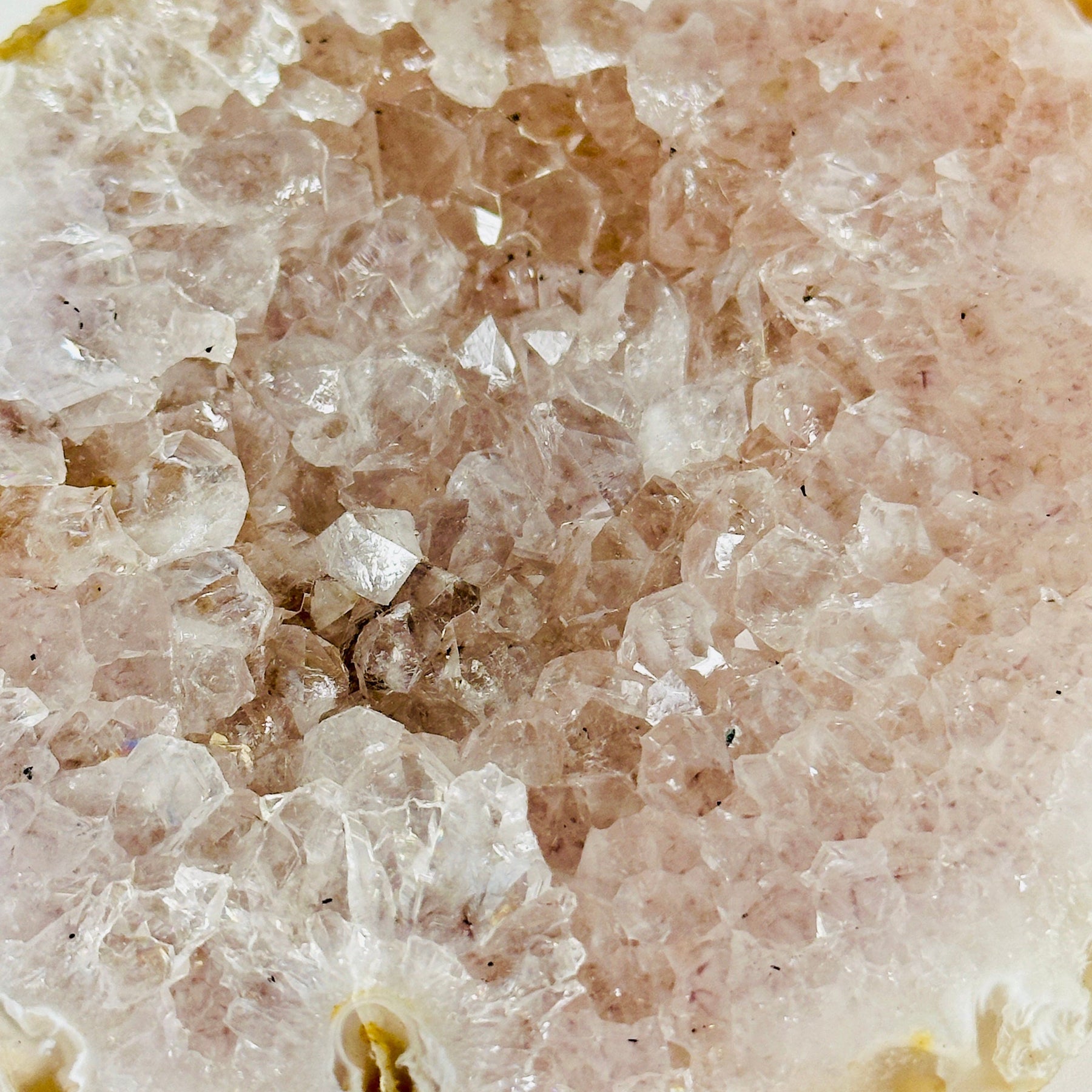 This Geode druzy box is natural and has been cut to show its hollow, shimmering crystal center. It comes with its crystal lid.