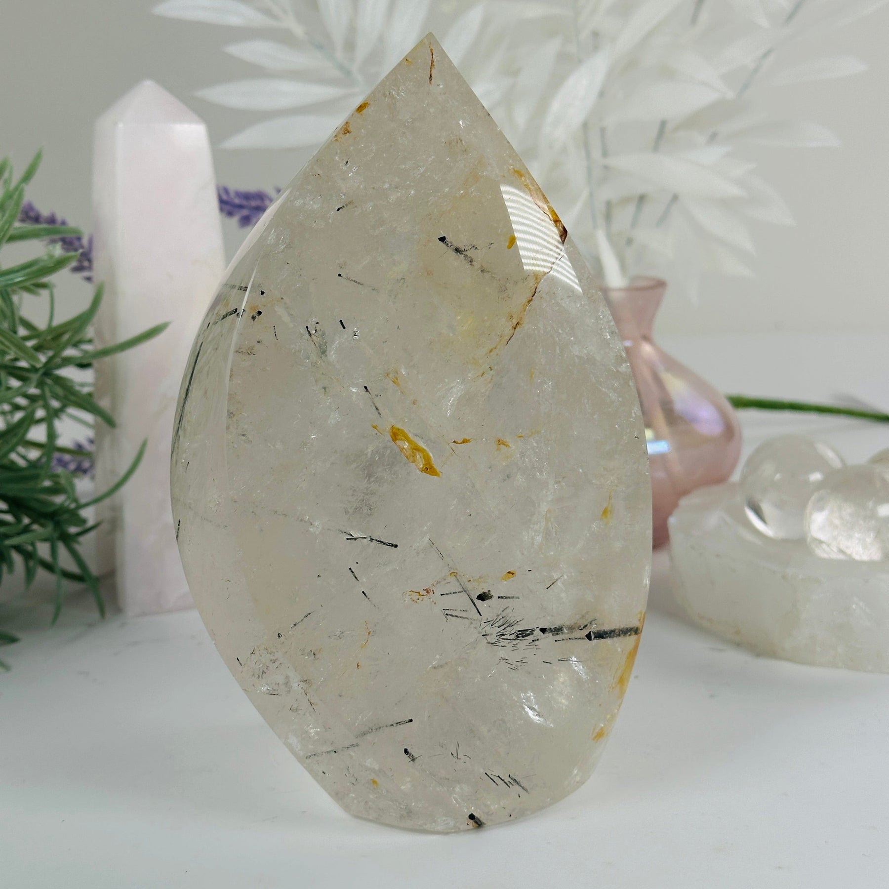 Shaped and Polished: This exquisitely crafted and polished form of the Golden Healer crystal showcases its beauty, with its golden veins running through the quartz. Each piece is unique, with its own character and charm.