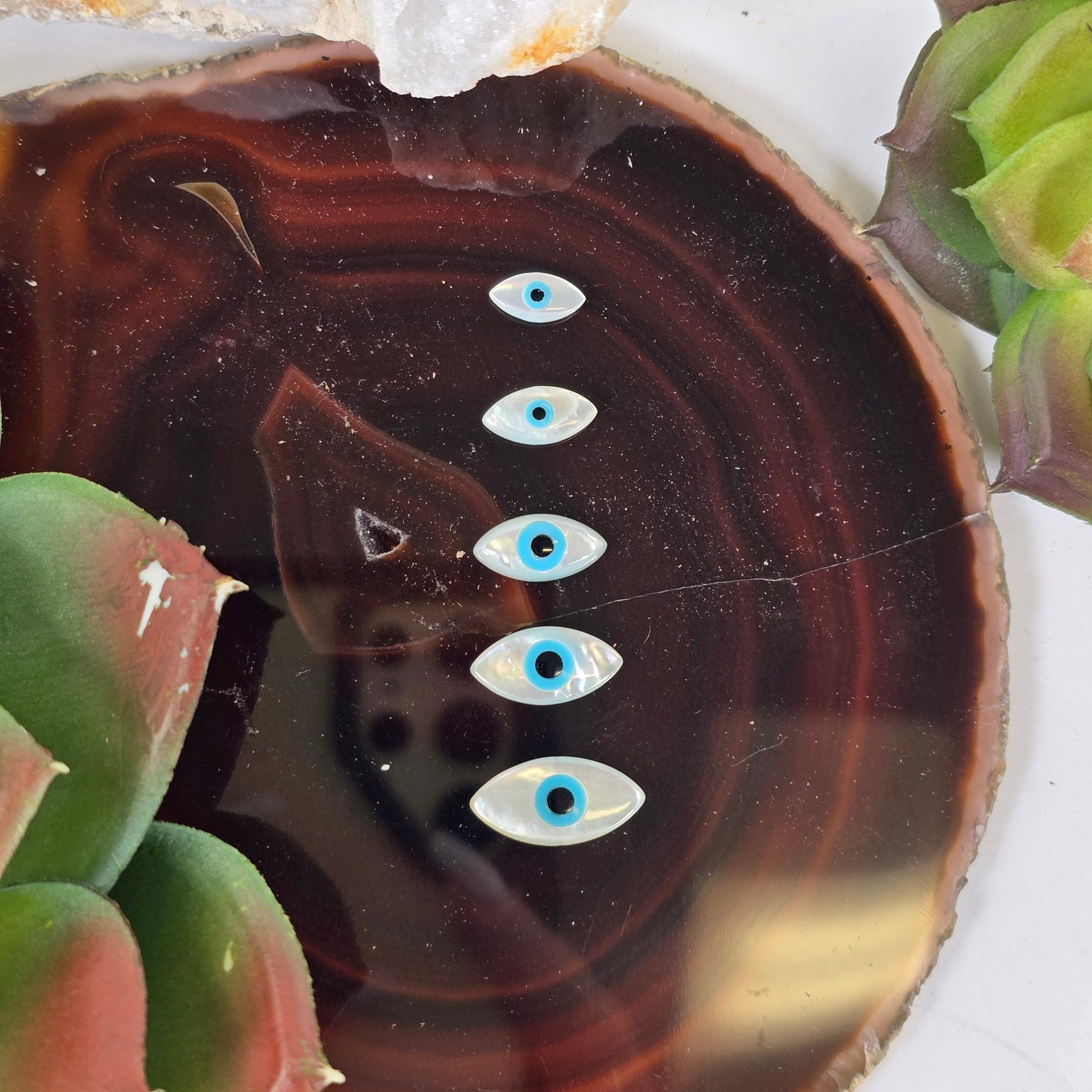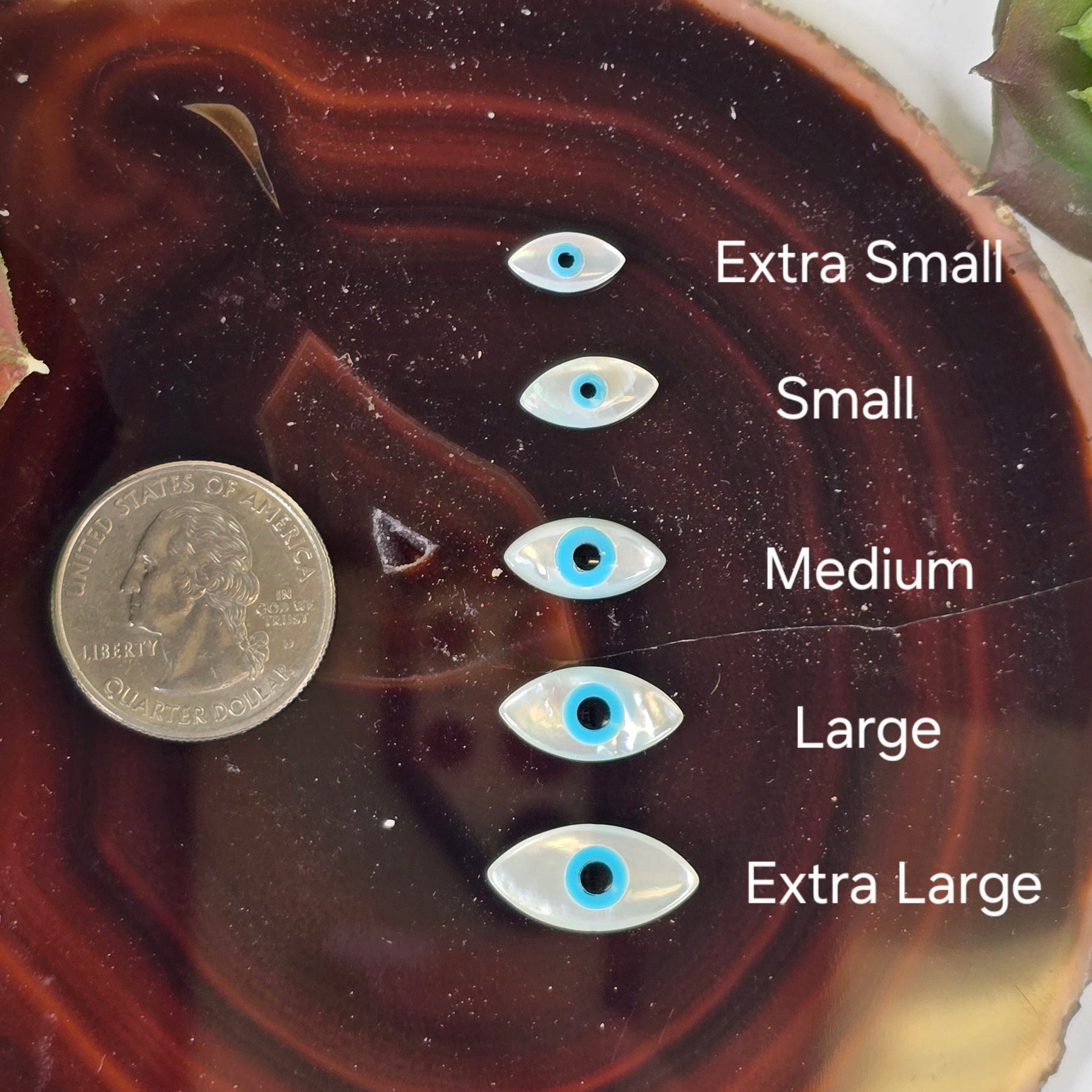 It is a common spiritual practice to wear a wide blue eye as protection against the evil eye to ward off forces that try to sabotage one's spiritual and material well-being. These mother of pearl evil eye cabochons are the perfect jewelry setting and craft supply for your spiritual needs. They come in five sizes: Extra Small, Small, Medium, Large and Extra Large.