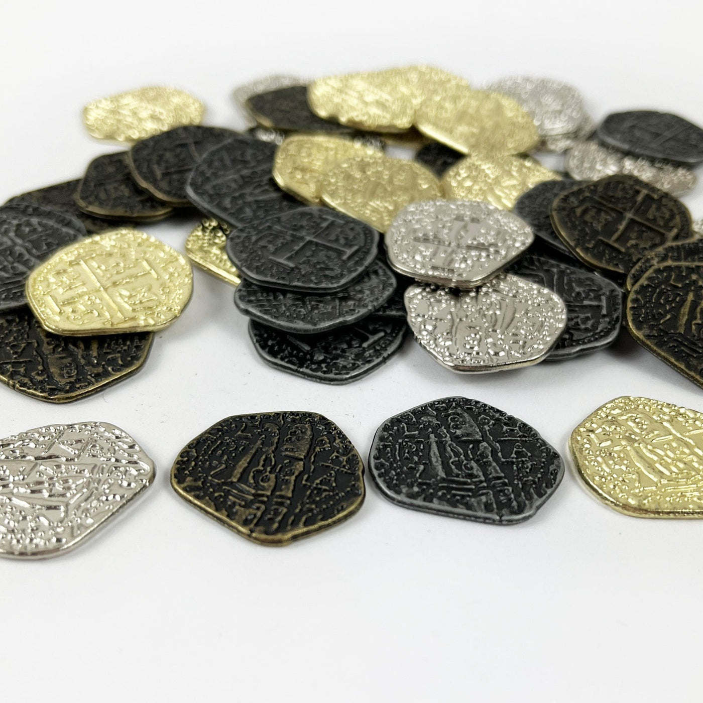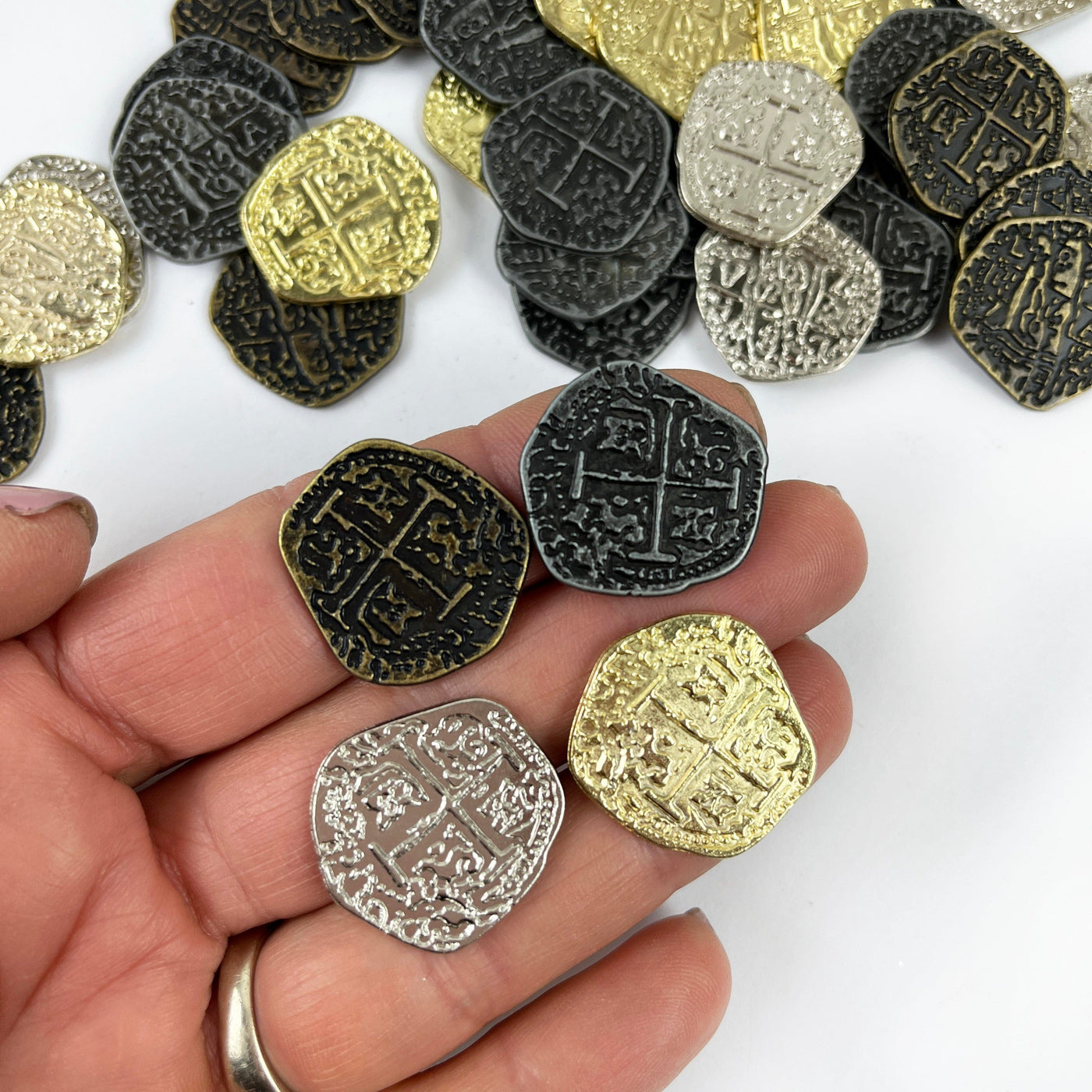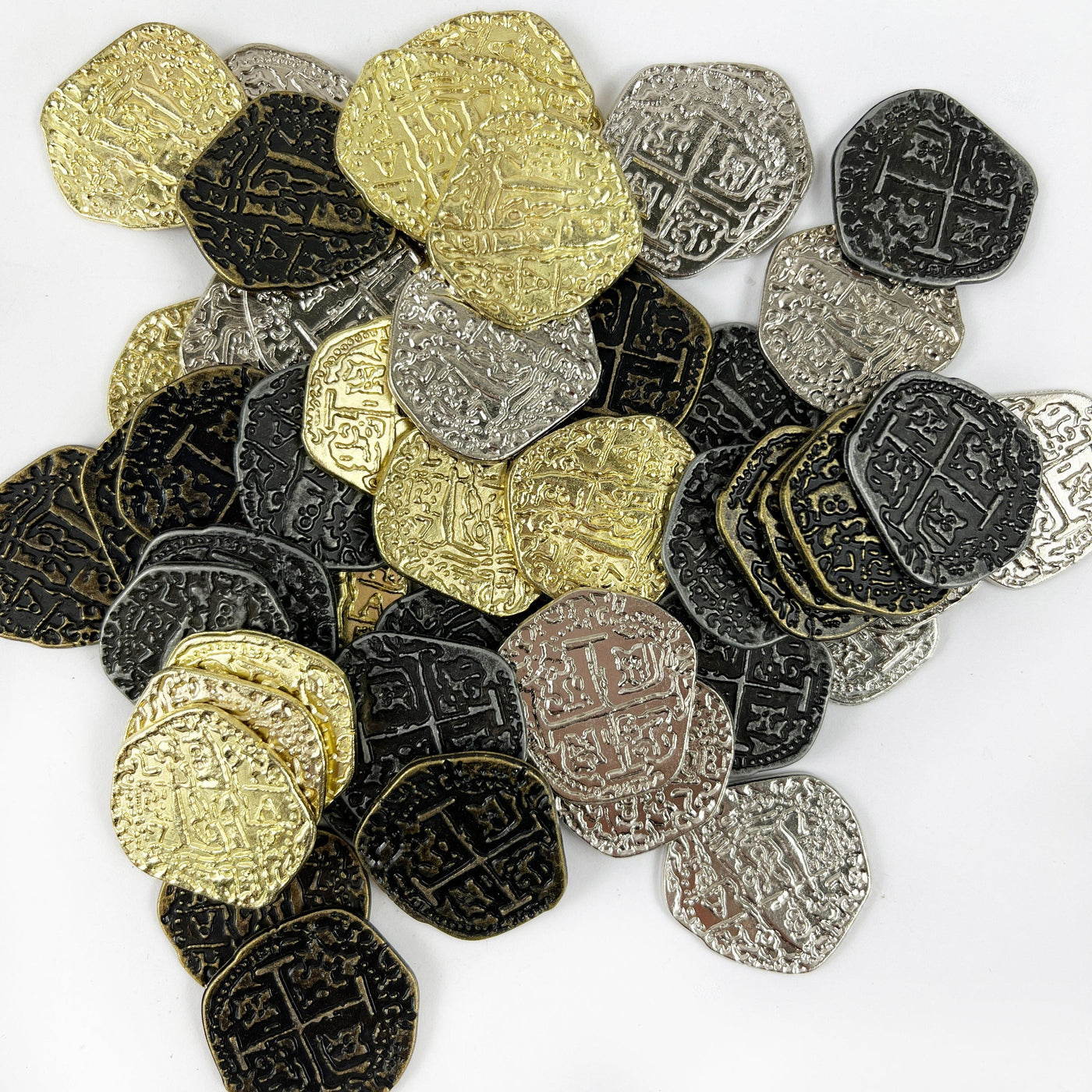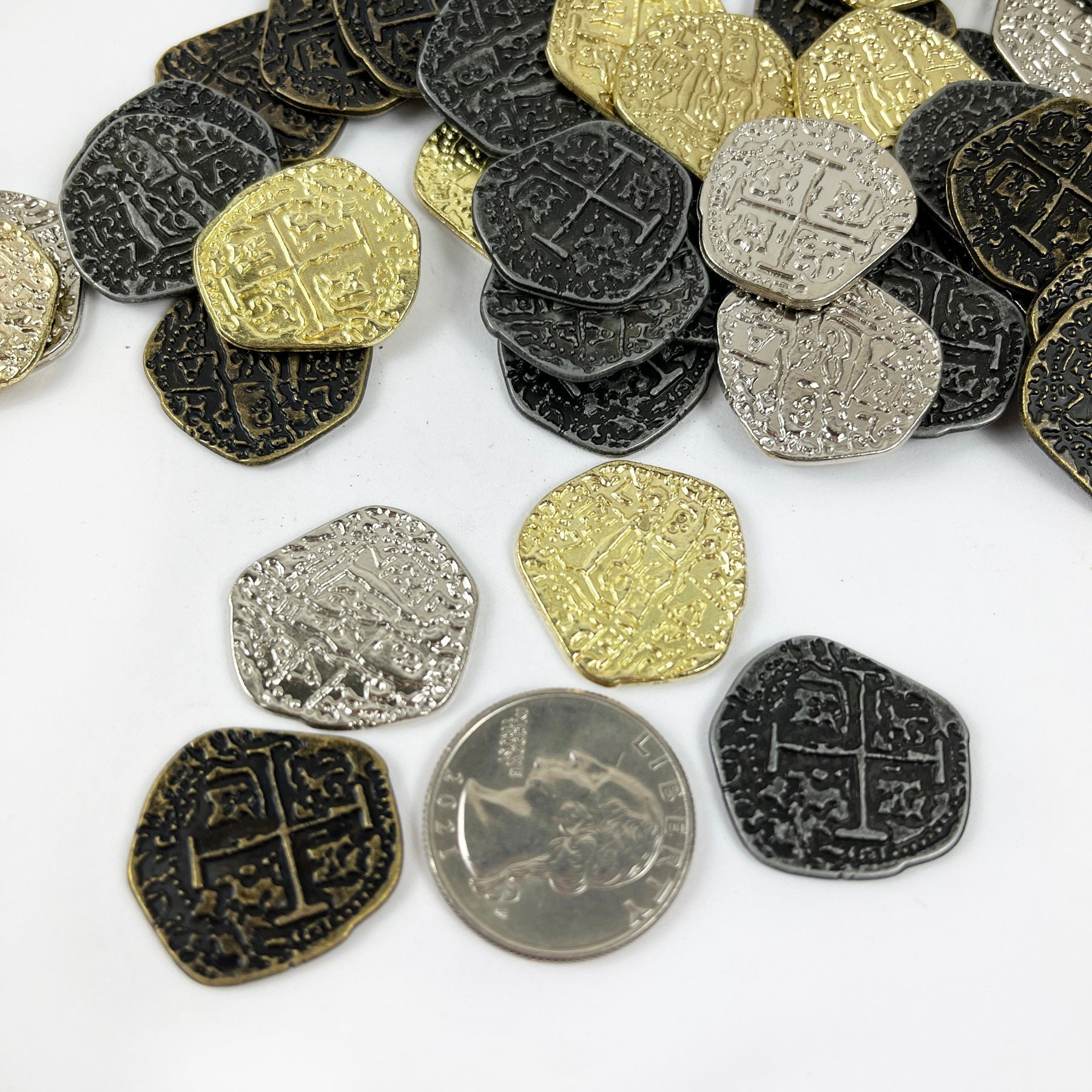 THIS LOT WILL CONSIST OF AN APPROXIMATE EQUAL MIXTURE OF GOLD AND SILVER COLORED TOY PIRATE TREASURE DOUBLOONS IN BOTH SHINY AND ANTIQUE FINISH